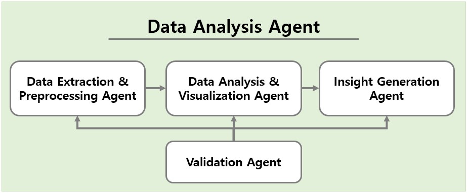 사람이 데이터 분석을 하는 경우 업무 중간중간에 필요한 사항을 직접 검증하는 작업을 하게 됩니다. 데이터 추출이나 전처리가 제대로 되었는지, 분석에 활용된 방법이 정확하고 시각화에 오류가 없는지, 결과와 인사이트가 제대로 도출되었는지를 직접 검증하는 작업을 거칩니다. Data 분석 Agent에서도 각각의 단계에서 그 결과를 검증하는 독립된 Agent가 구축되어야 합니다. 이를 통해 분석 성능을 높일 수 있습니다.